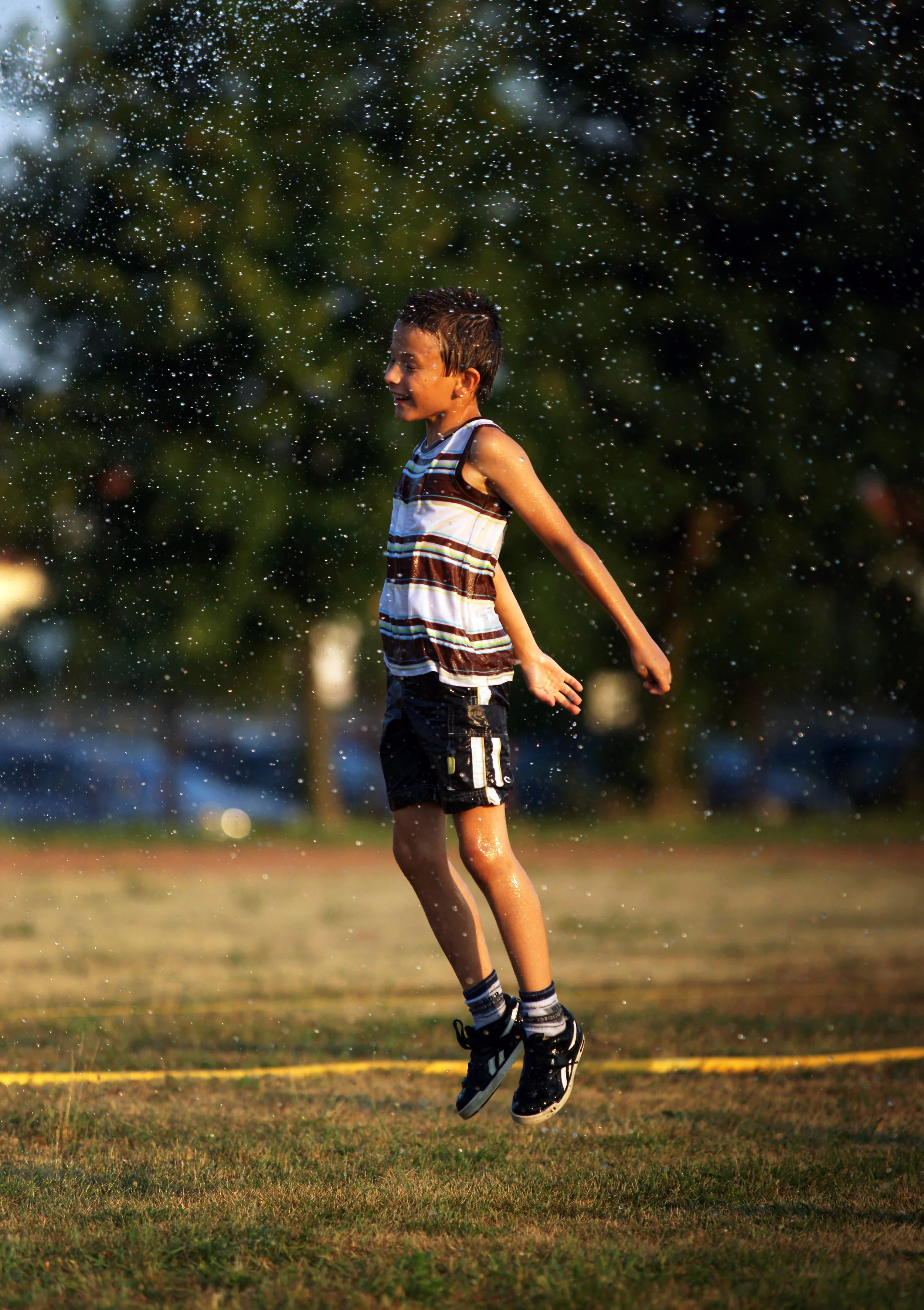 Boy jumping joyfully in a park, surrounded by water splashes, wearing a striped tank top and black shorts. View fullsize