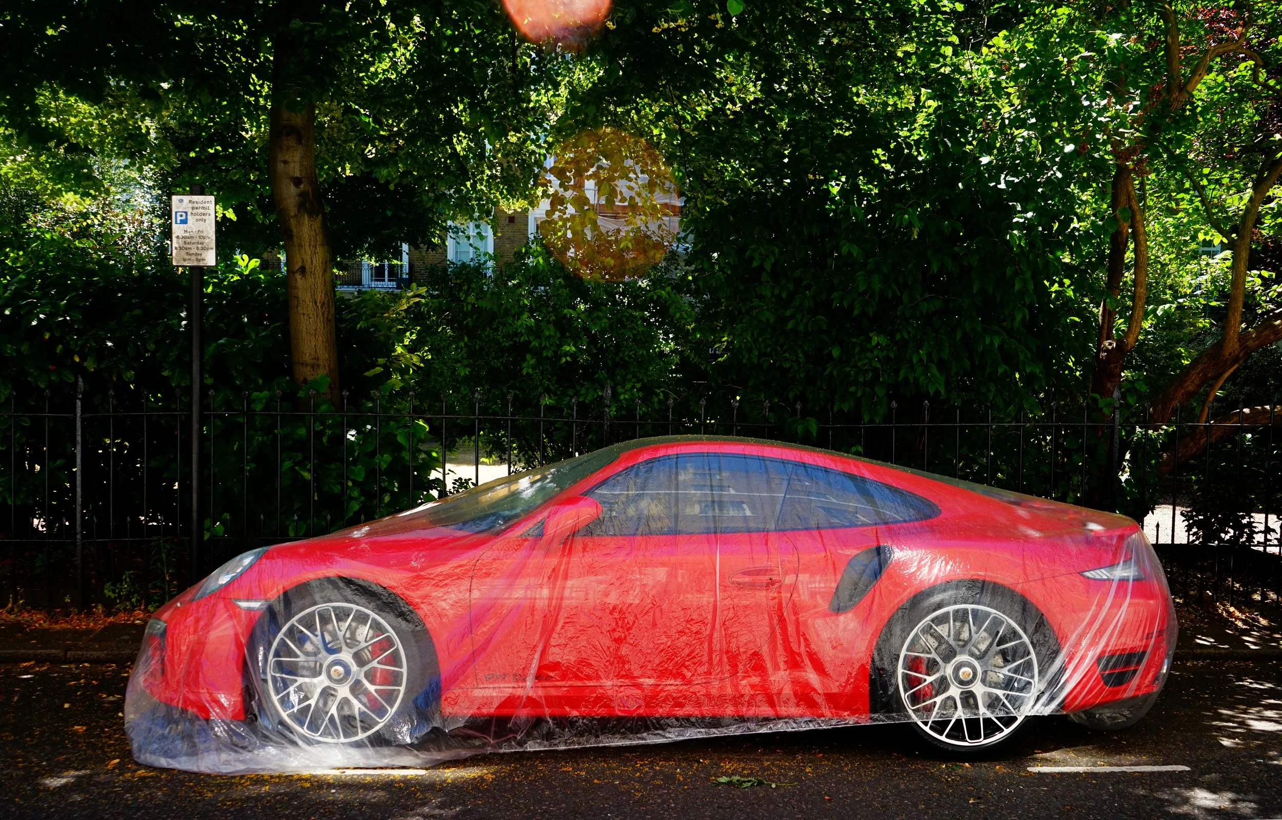 Red sports car covered with plastic parked on a street next to trees. View fullsize
