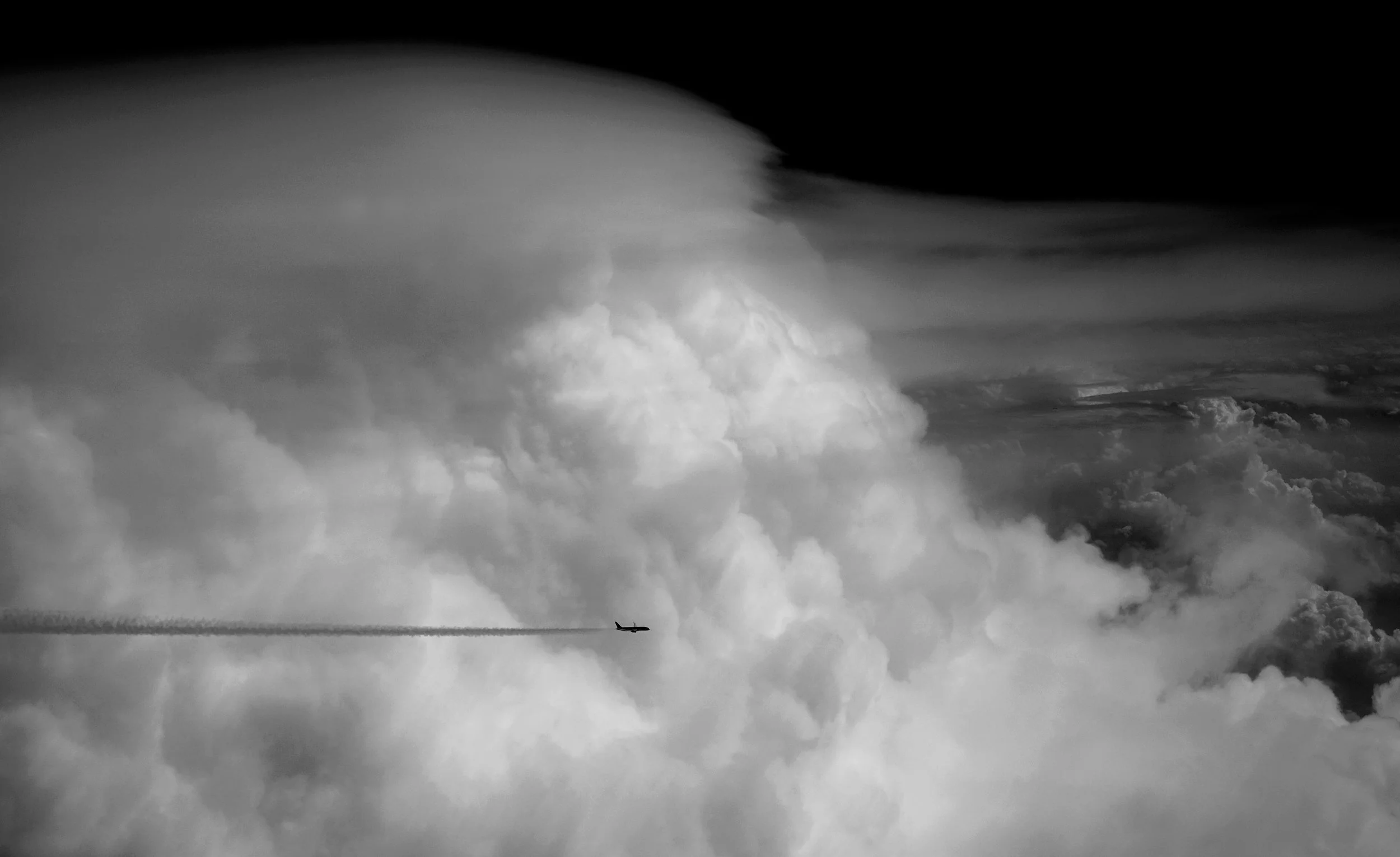 Airplane flying through thick clouds, leaving a contrail, in black and white. View fullsize