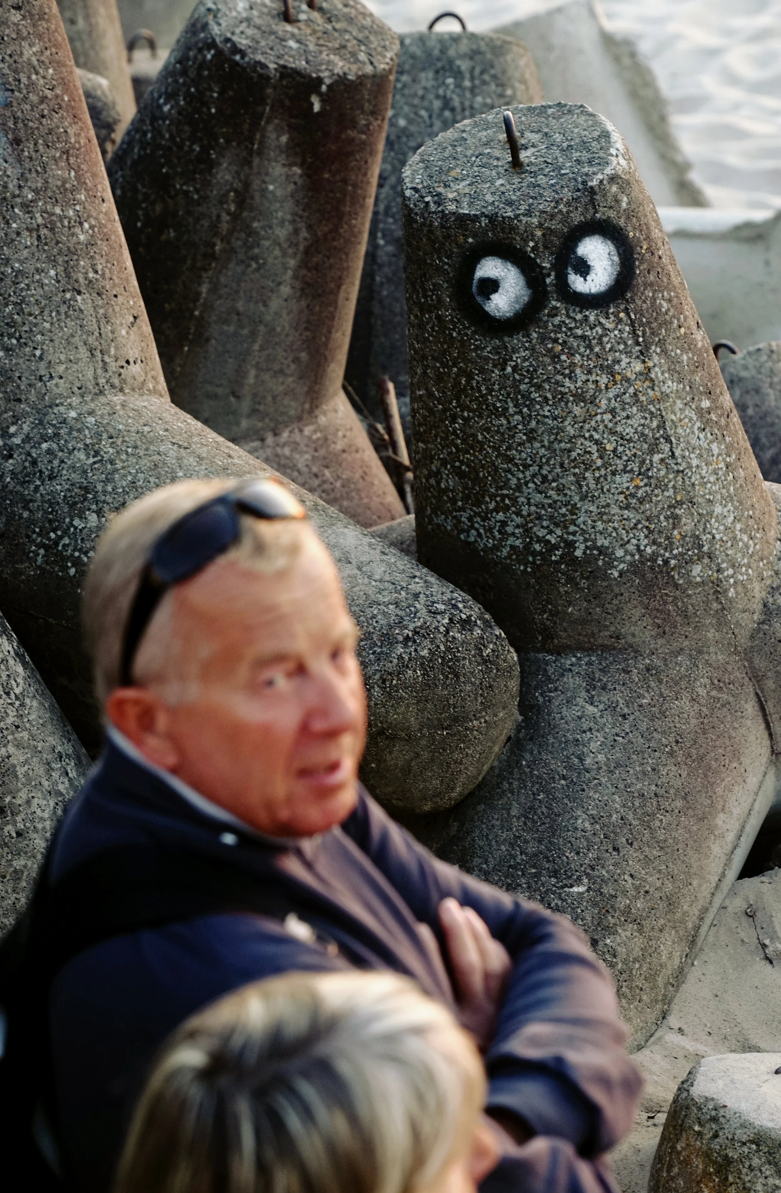 Concrete breakwater structures with graffiti eyes, a person blurred in foreground. View fullsize