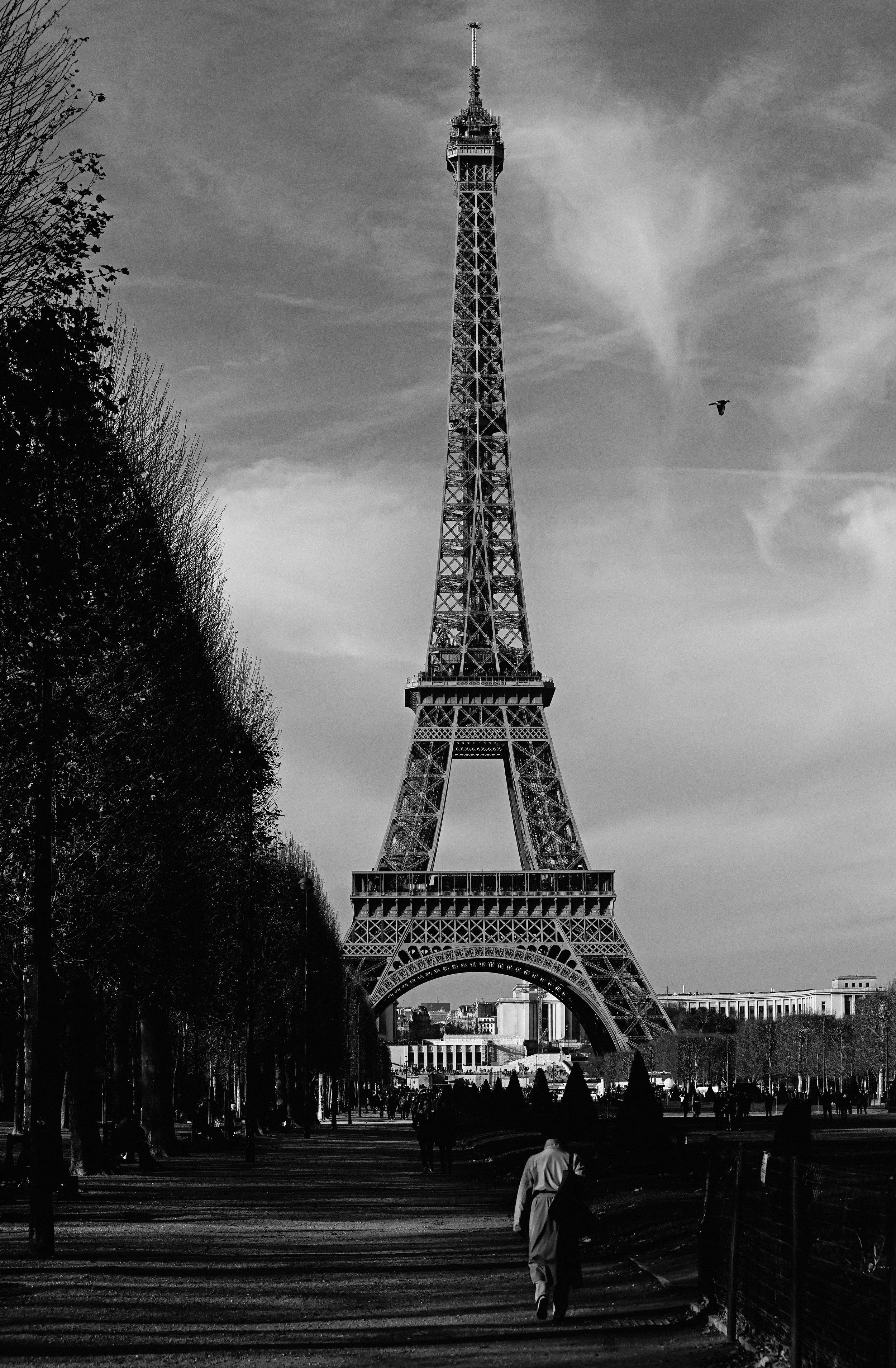 Black and white photo of the Eiffel Tower in Paris, surrounded by trees and a pedestrian path in the foreground.