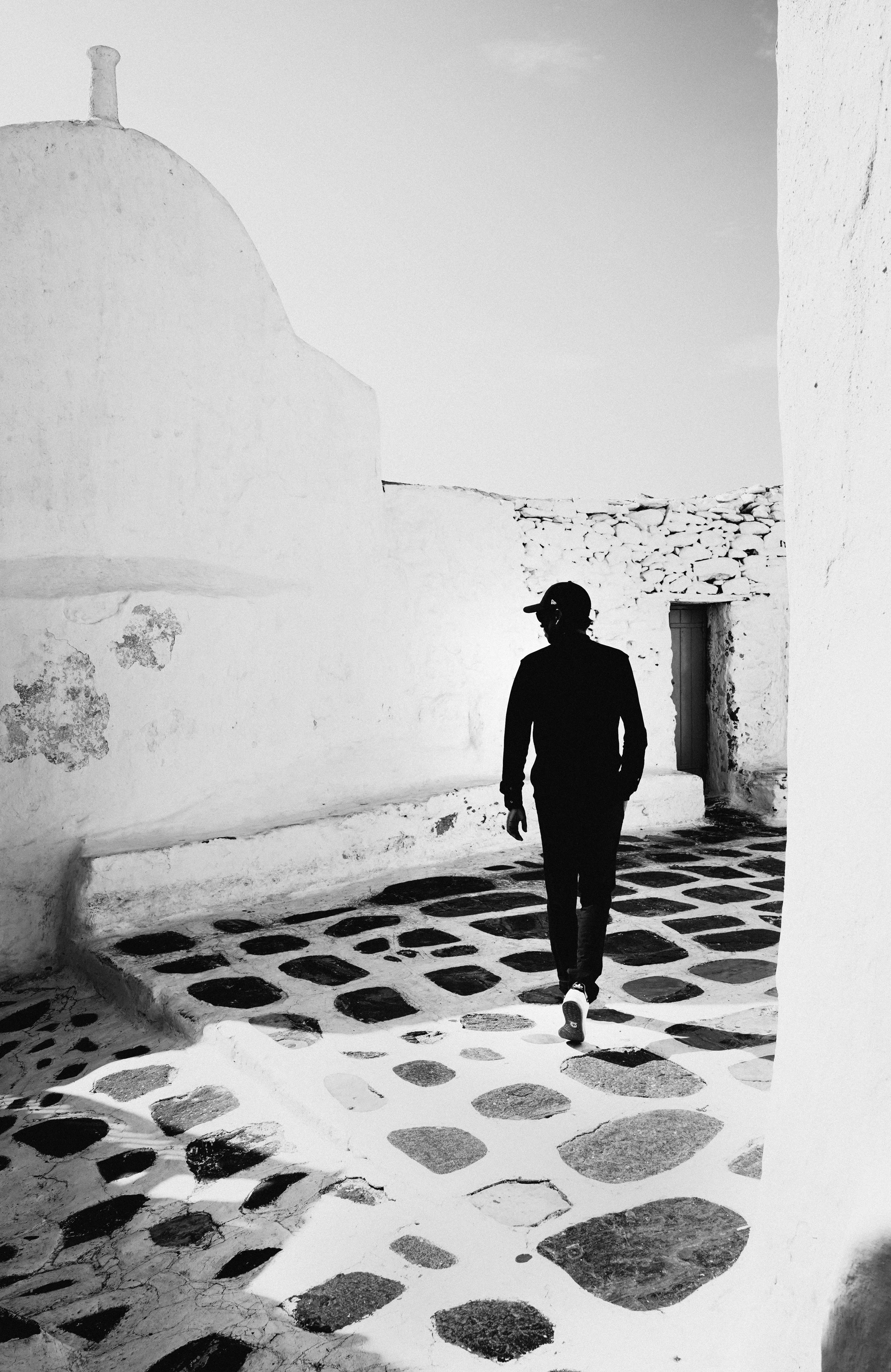 Silhouette of a person walking on a cobblestone path in a whitewashed architectural setting, possibly Mediterranean, captured in black and white. View fullsize