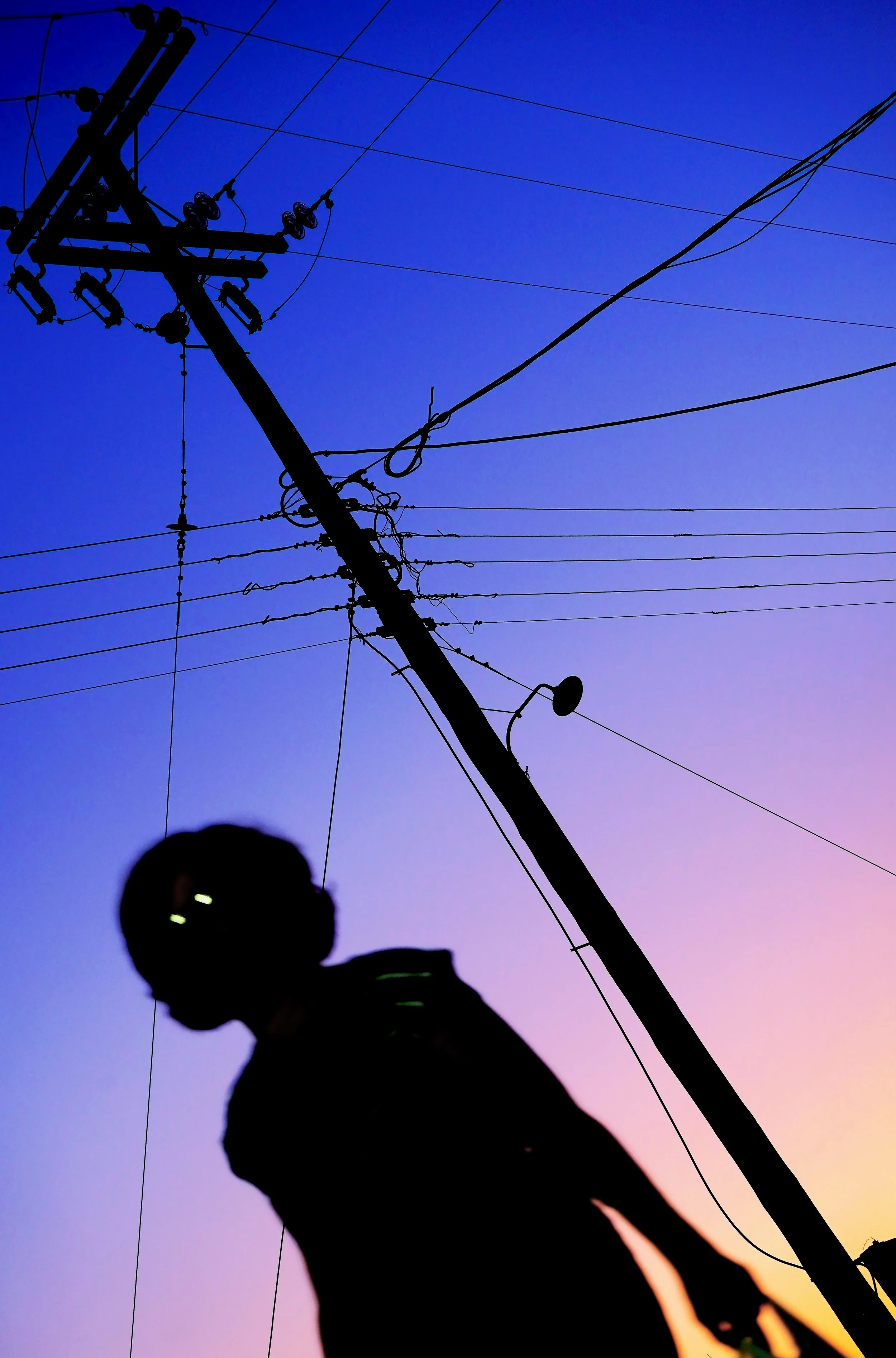 Silhouette of a person beneath power lines and a utility pole against a sunset sky. View fullsize