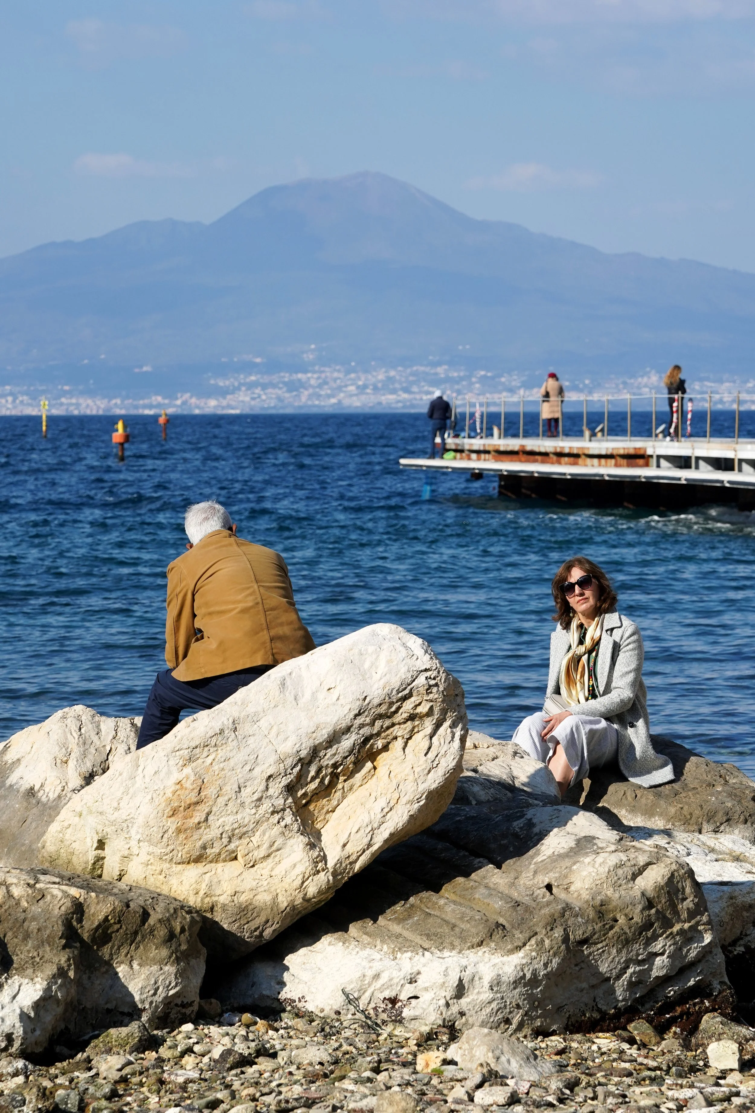 Two people sitting on rocks by the sea, with a mountain in the background and a pier with people in the distance. View fullsize