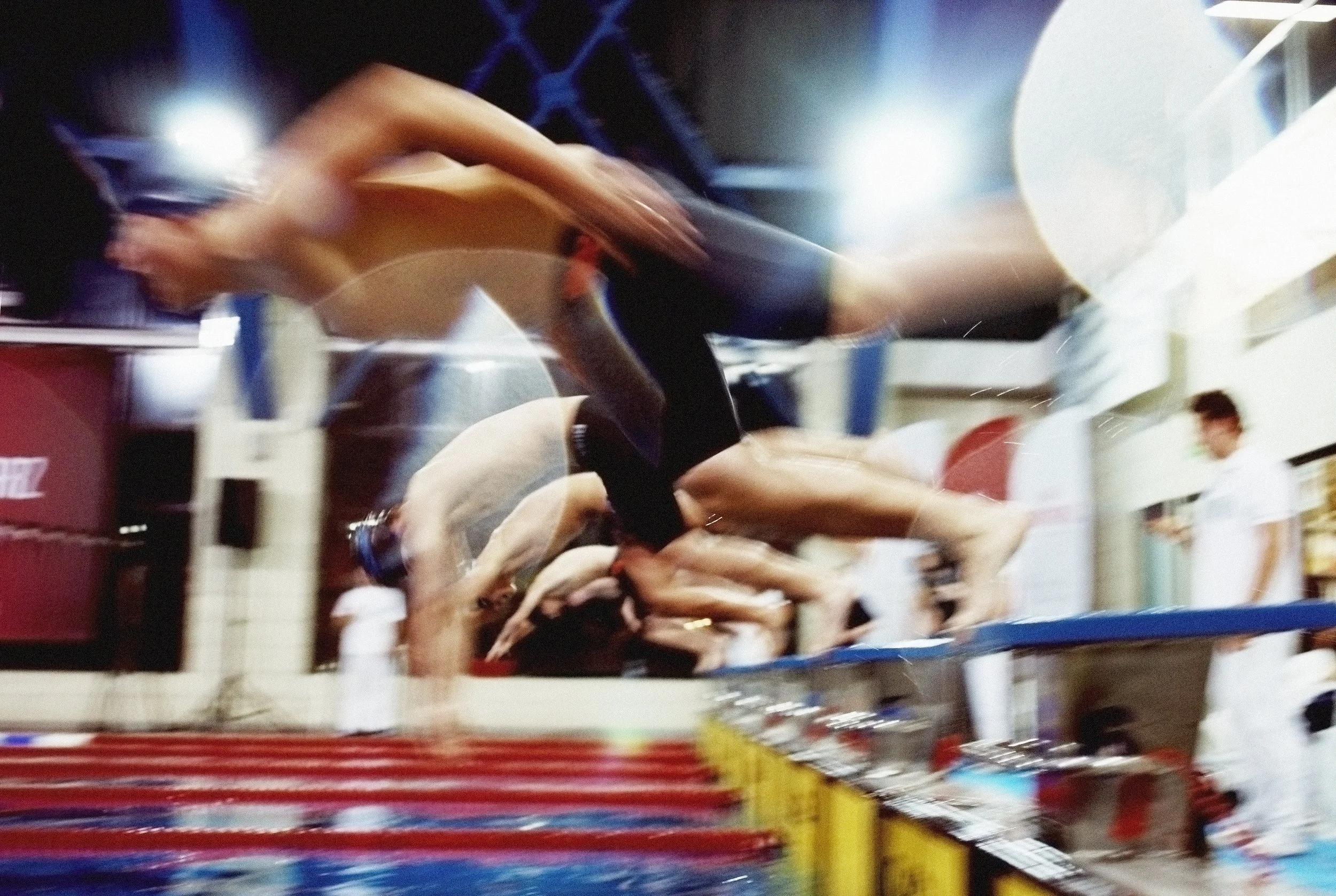 Swimmers diving into a pool at the start of a race, with motion blur capturing their dynamic movement.