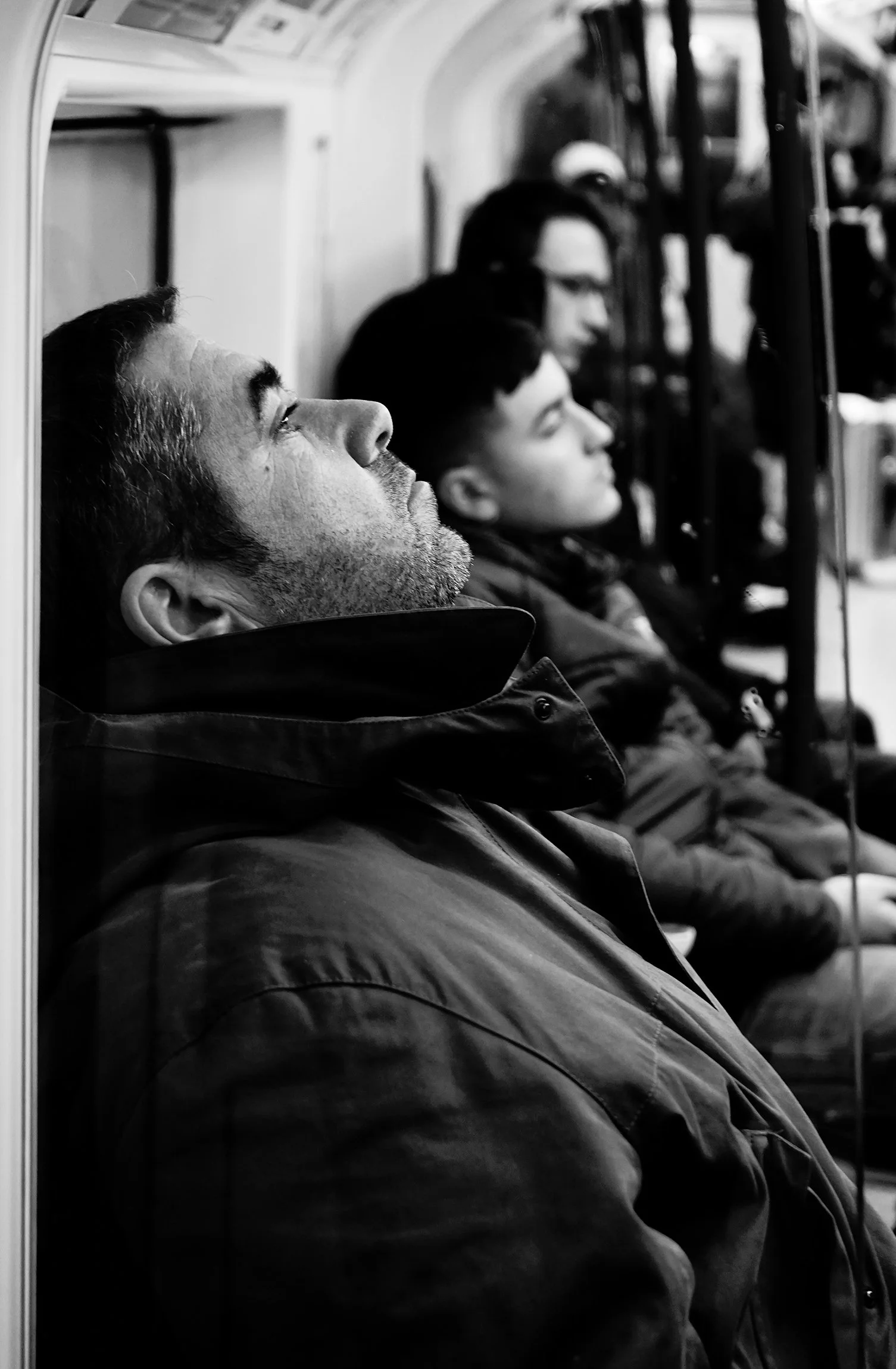 Black and white photo of people sitting in a subway train, appearing relaxed or asleep, with a man in the foreground leaning against the wall.