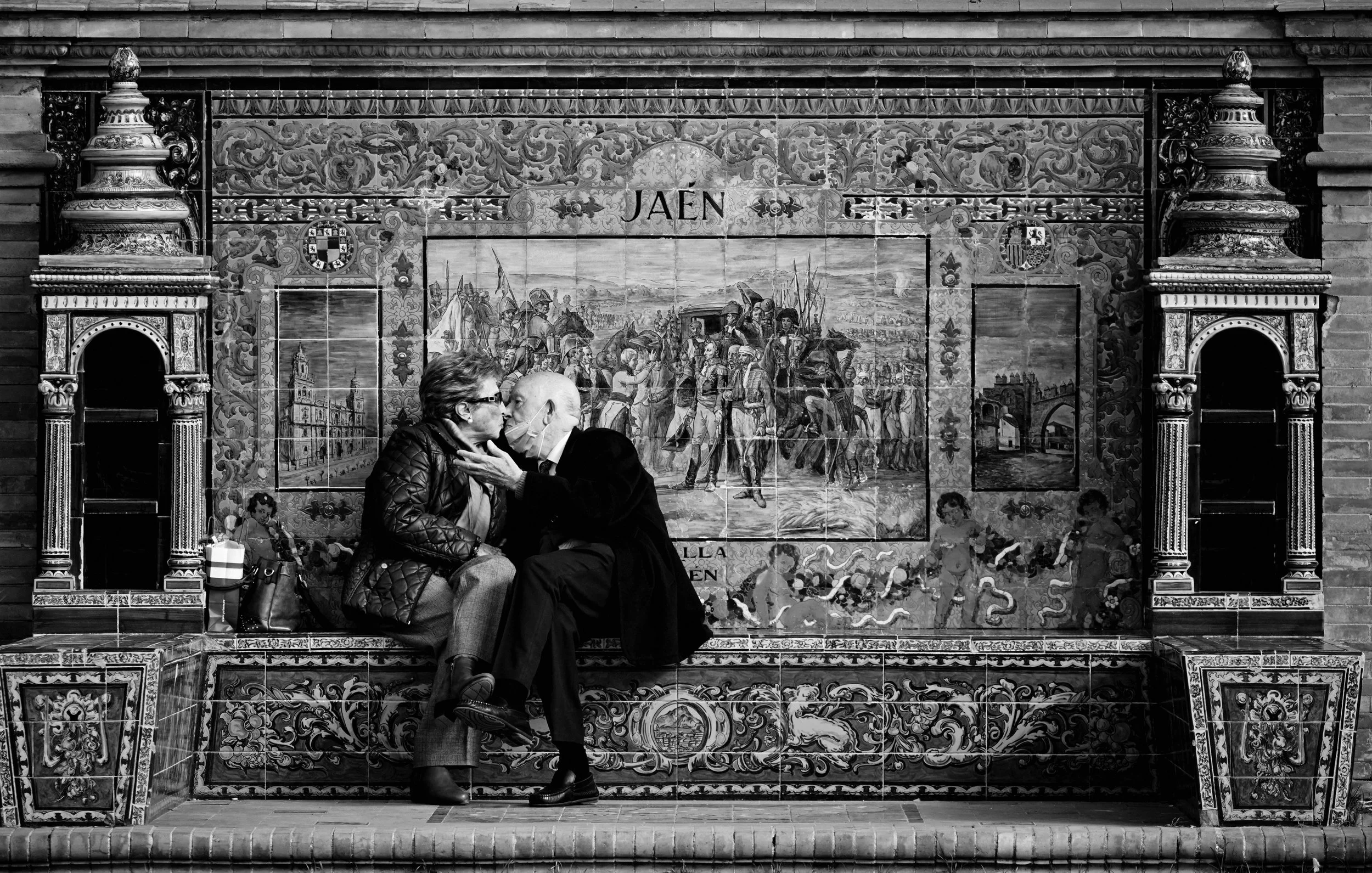 An elderly couple kissing on a decorative tiled bench with ornate artwork behind them depicting a historical scene, in black and white.