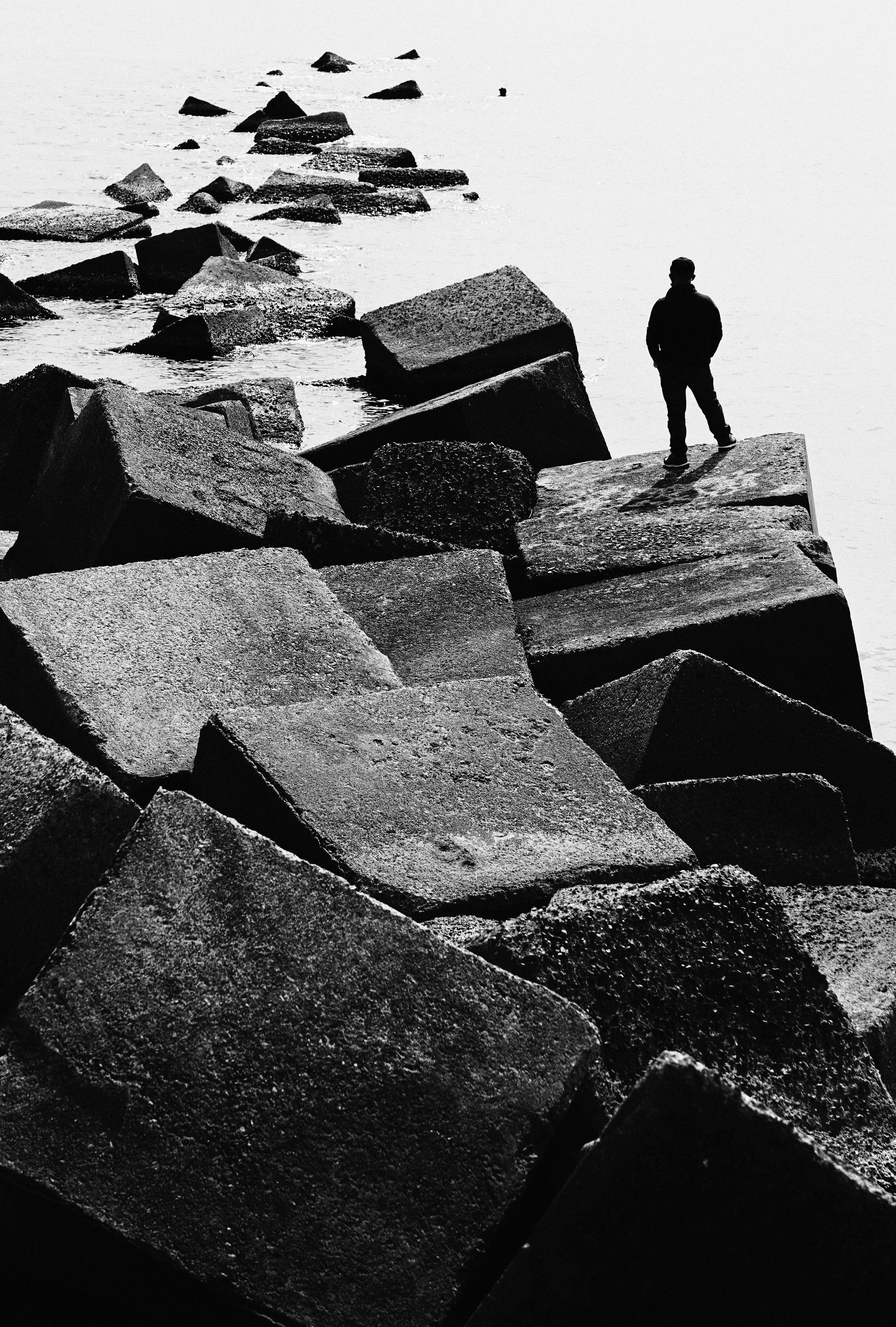 Silhouette of a person standing on large, angular rocks along the shoreline, with a distant view of the sea in black and white.