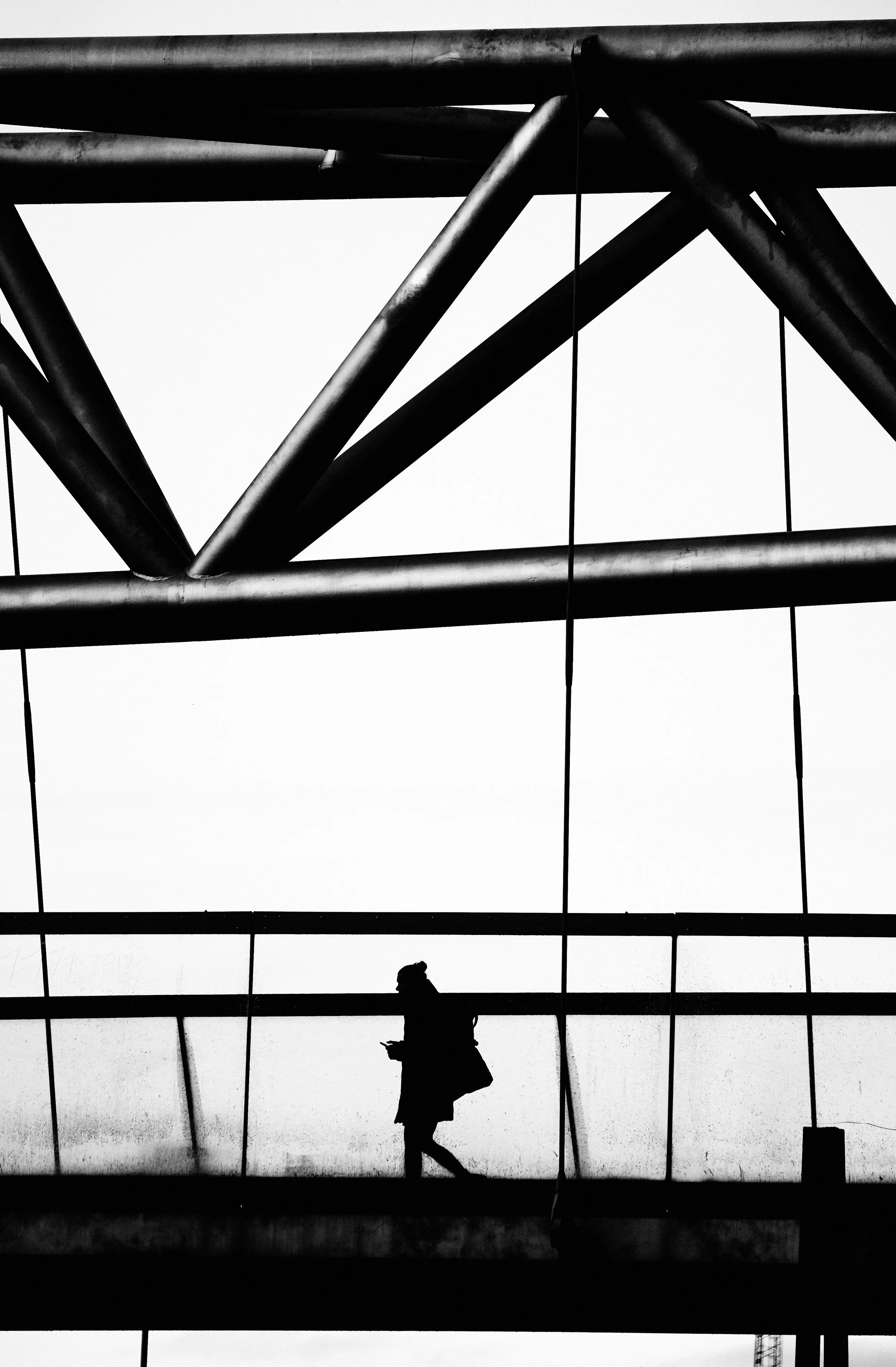 Silhouette of a person walking on a pedestrian bridge against a background of large, industrial pipes and metal framework.