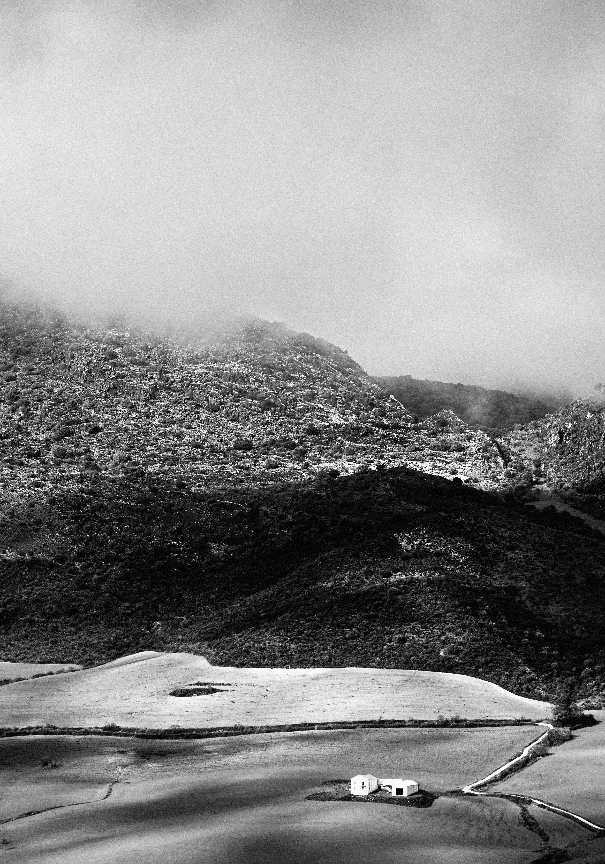 Black and white landscape with hills, clouds, and a solitary house View fullsize