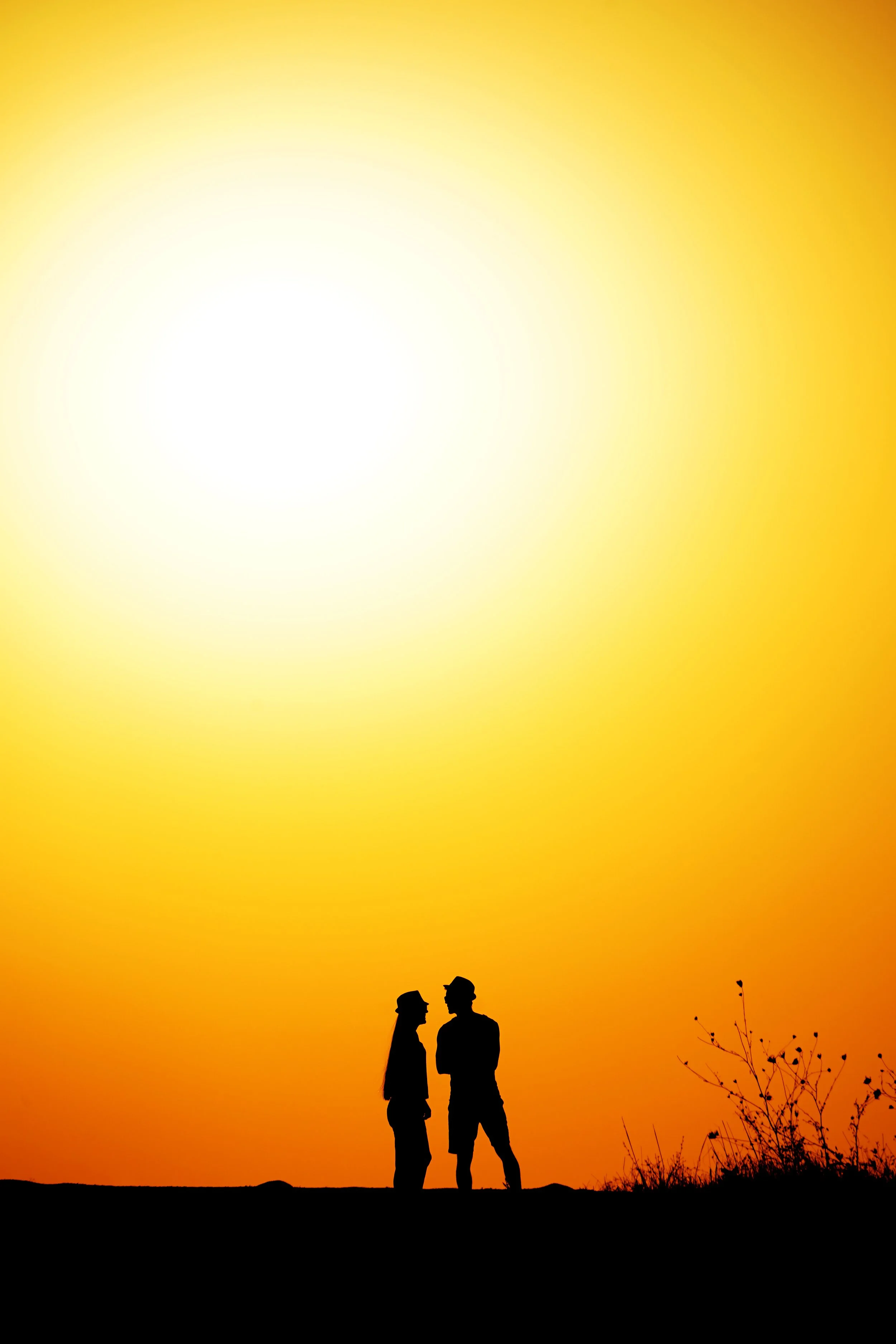 Silhouette of two people talking against an orange sunset background, standing on a hill with sparse vegetation. View fullsize
