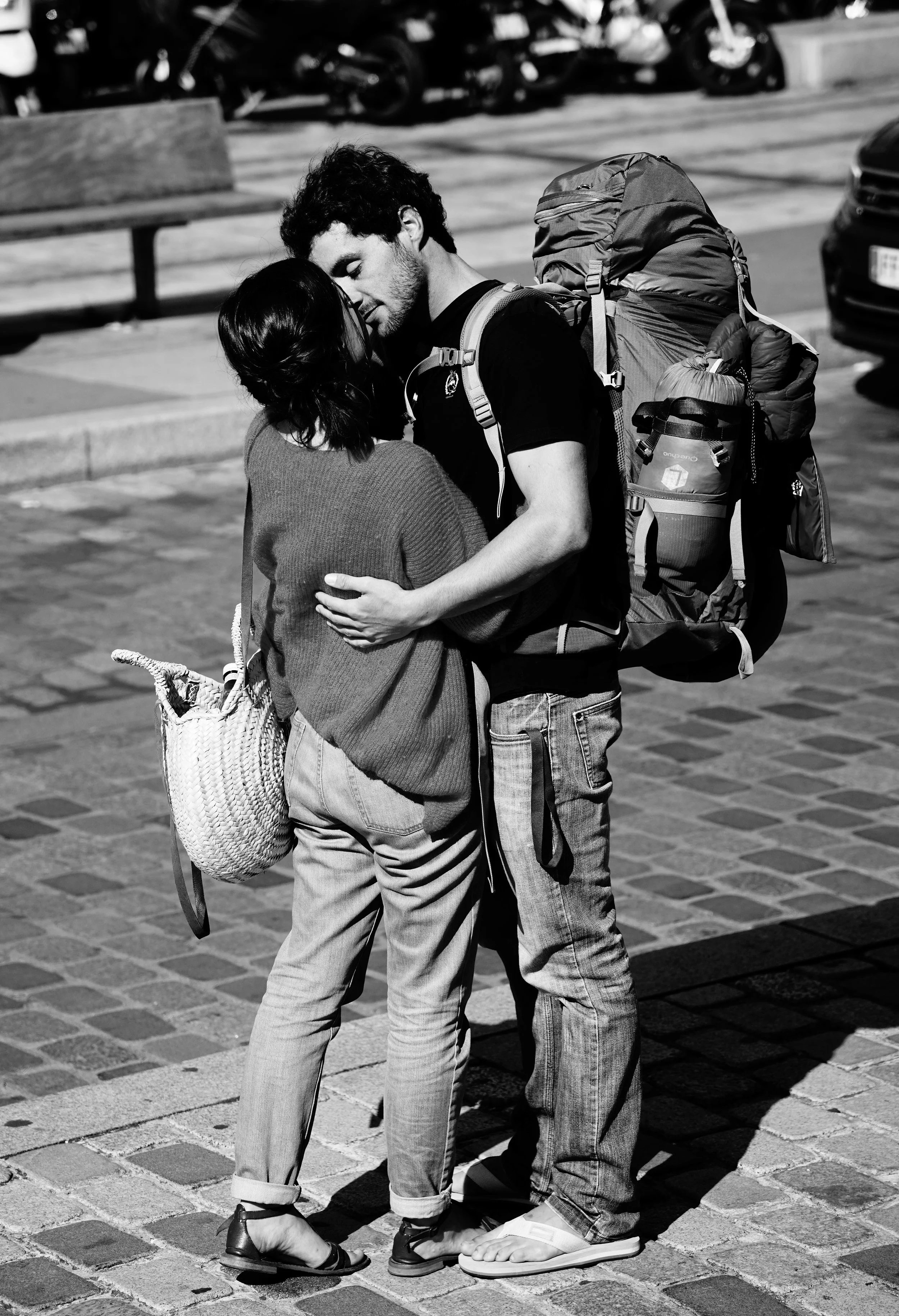 Black and white photo of a couple embracing on a cobblestone street. The man has a large backpack and is wearing casual clothes, while the woman holds a woven bag and wears a sweater and jeans. View fullsize