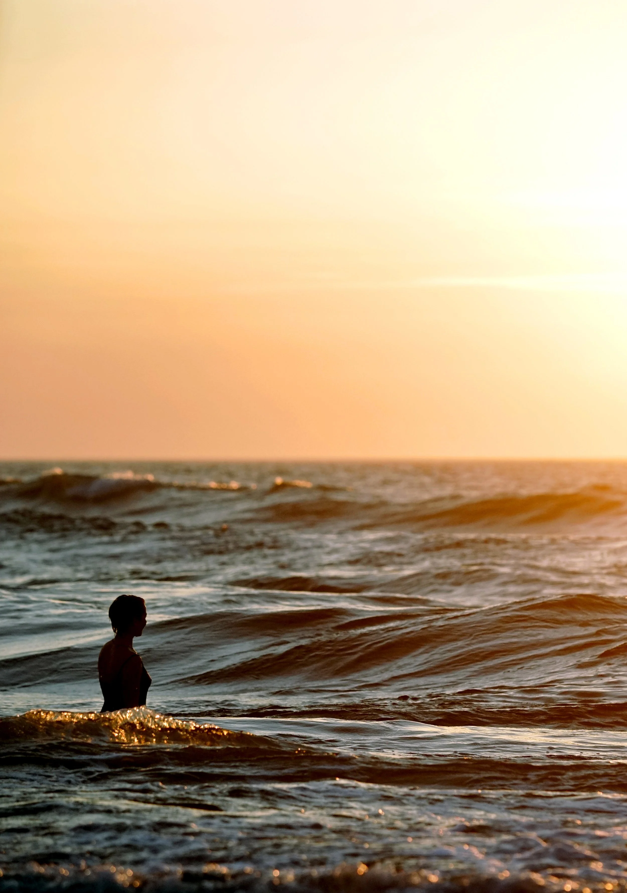 Silhouette of a person standing in the ocean during sunset View fullsize