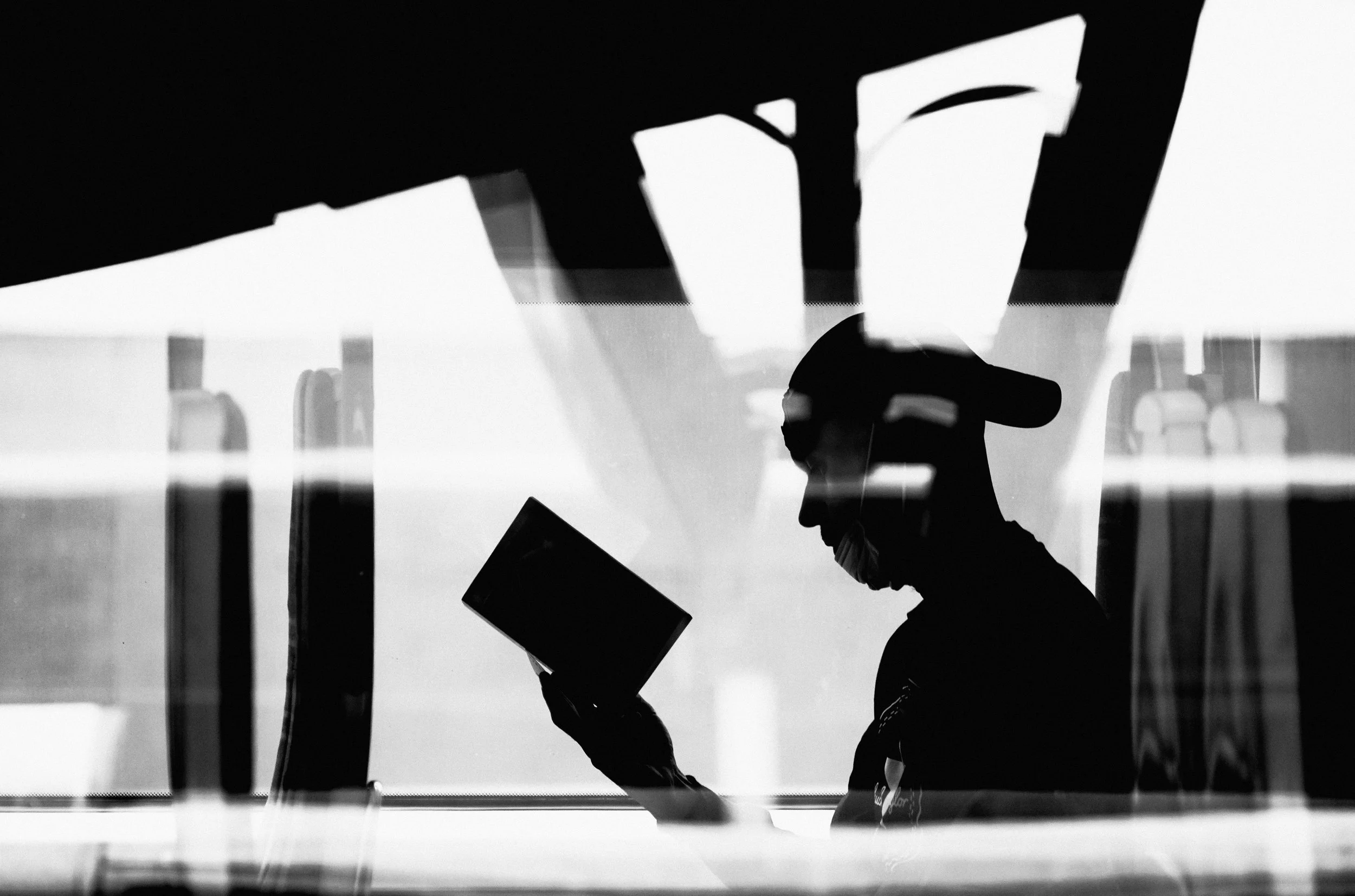 Silhouette of a person reading a book on a train; black and white, with reflections and window frames creating abstract patterns.