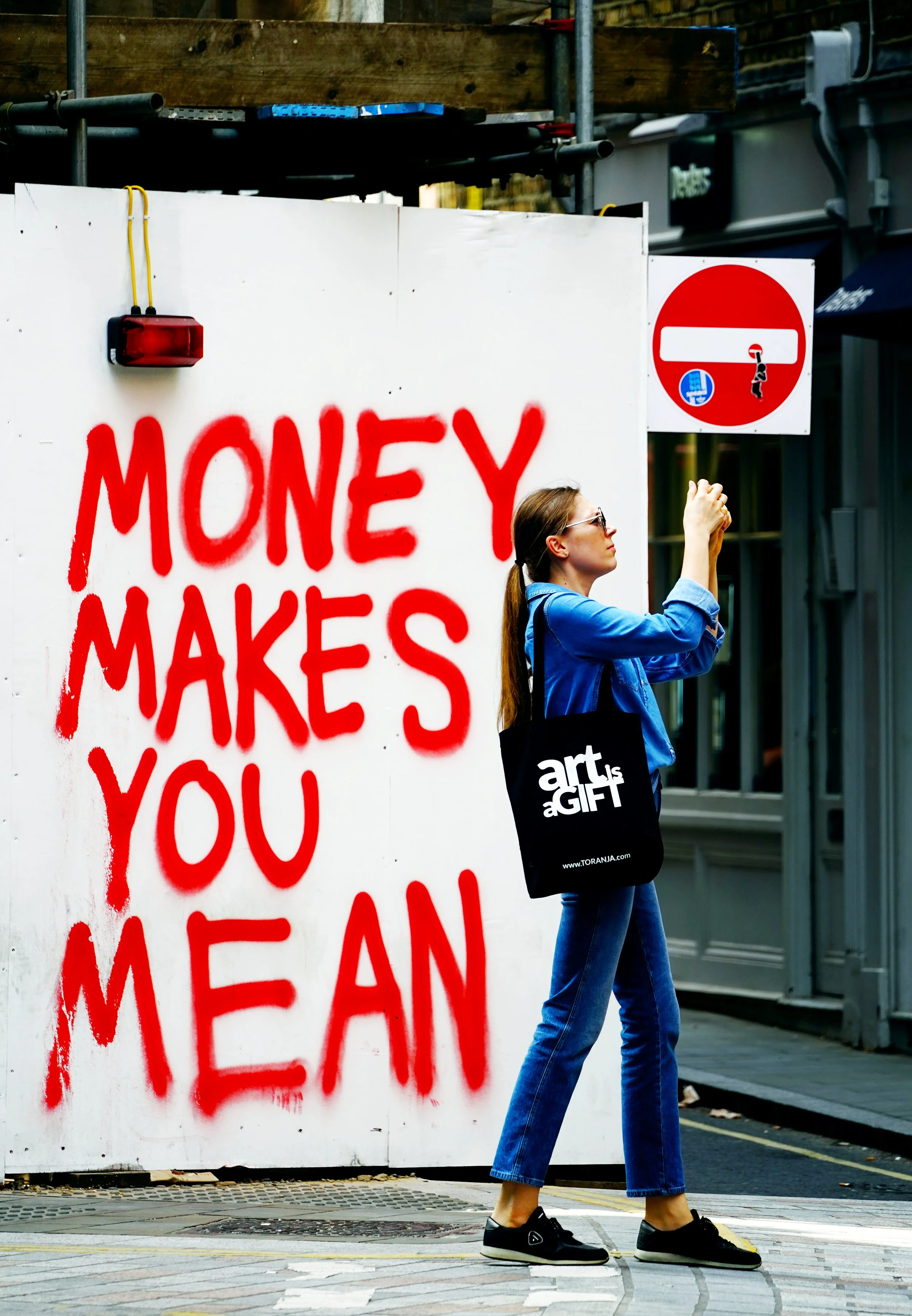 A woman in blue clothing and sunglasses walks past graffiti that says "MONEY MAKES YOU MEAN" in red spray paint. She holds a smartphone and carries a black bag with "art is a GIFT" printed on it. A no entry sign is visible in the background.
