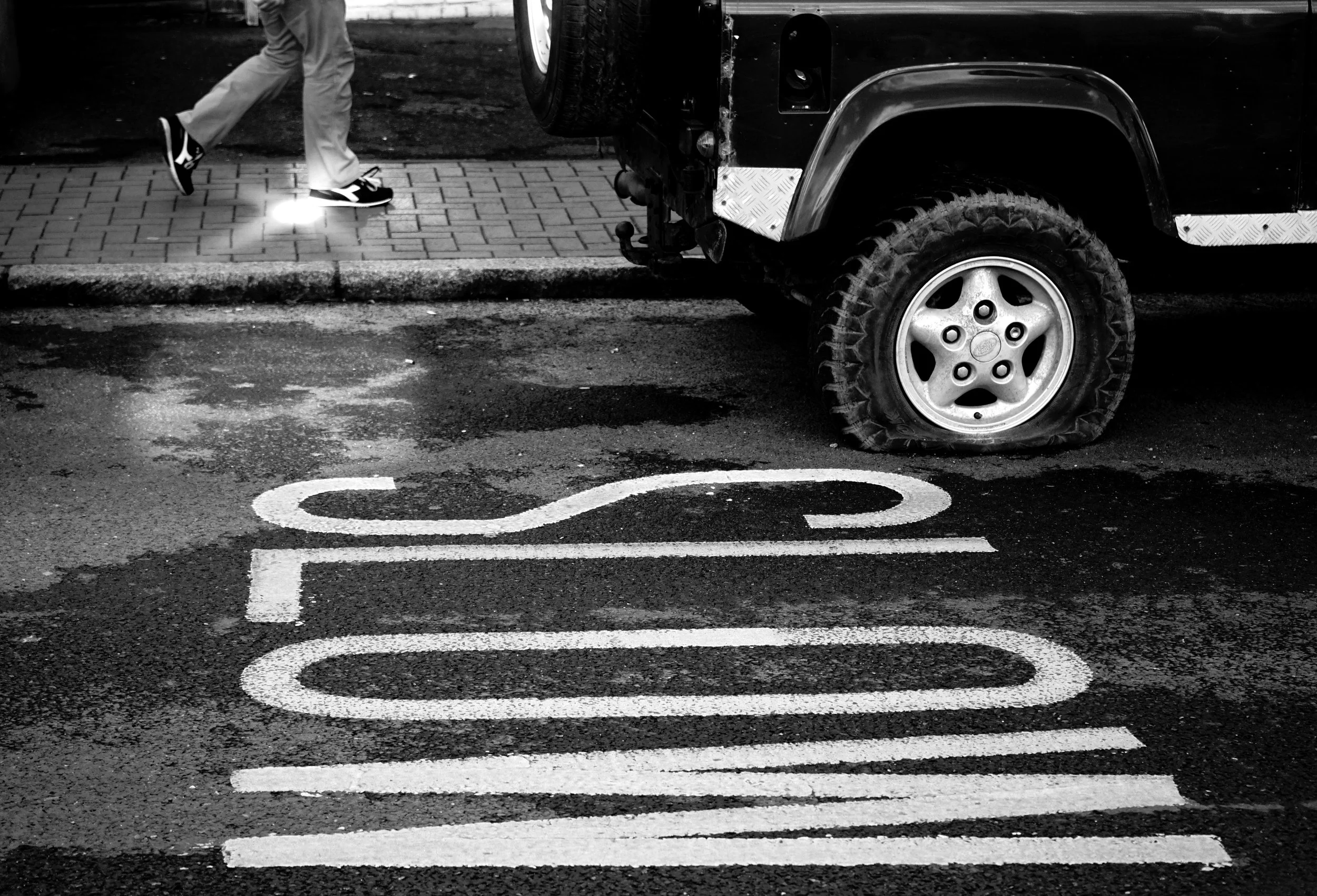 Black and white photo of a person walking on a sidewalk with illuminated shoes, next to a parked vehicle with a flat tire. ‘Slow’ is painted on the road. View fullsize