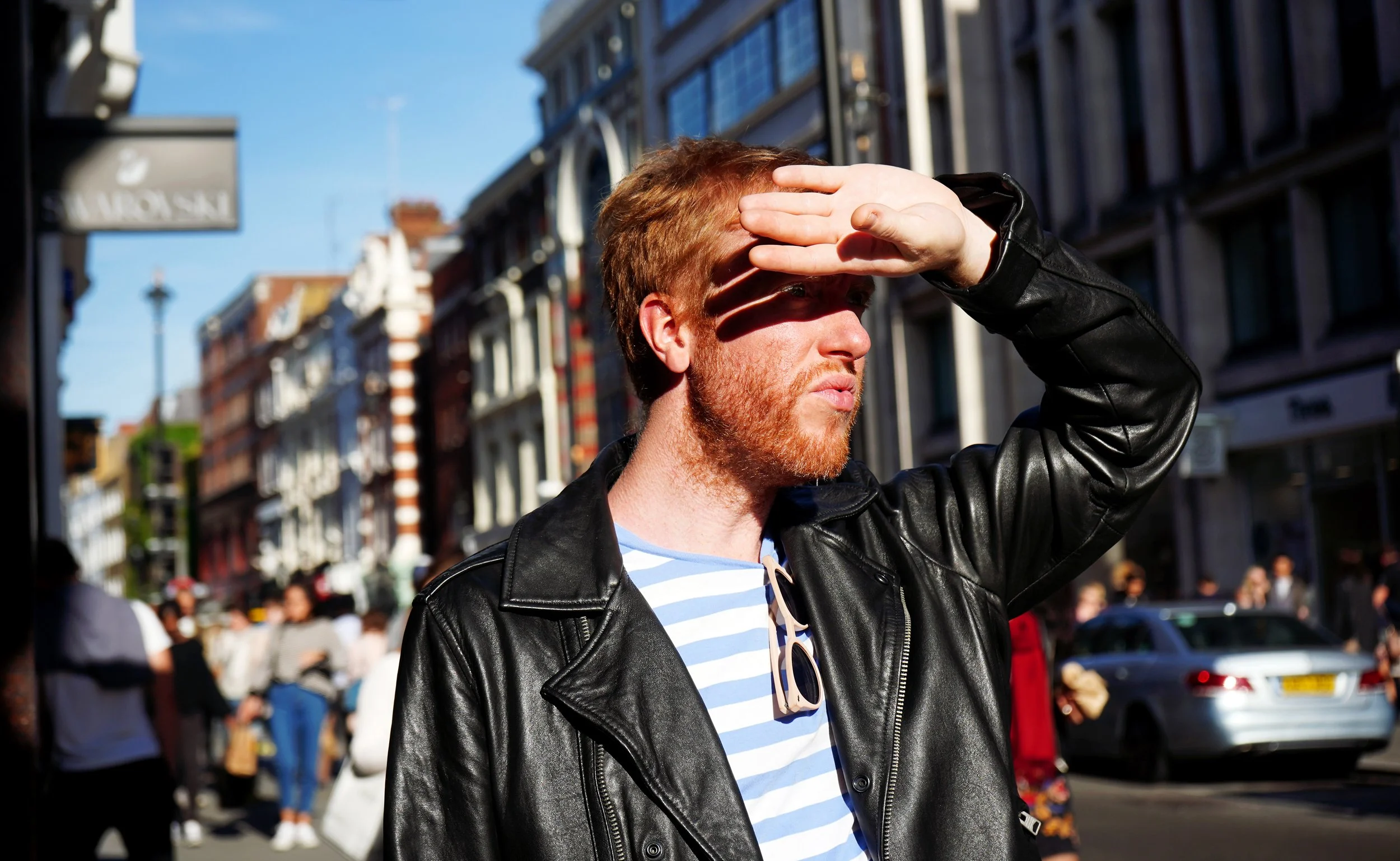 Man in black leather jacket shielding eyes from sun on busy city street View fullsize