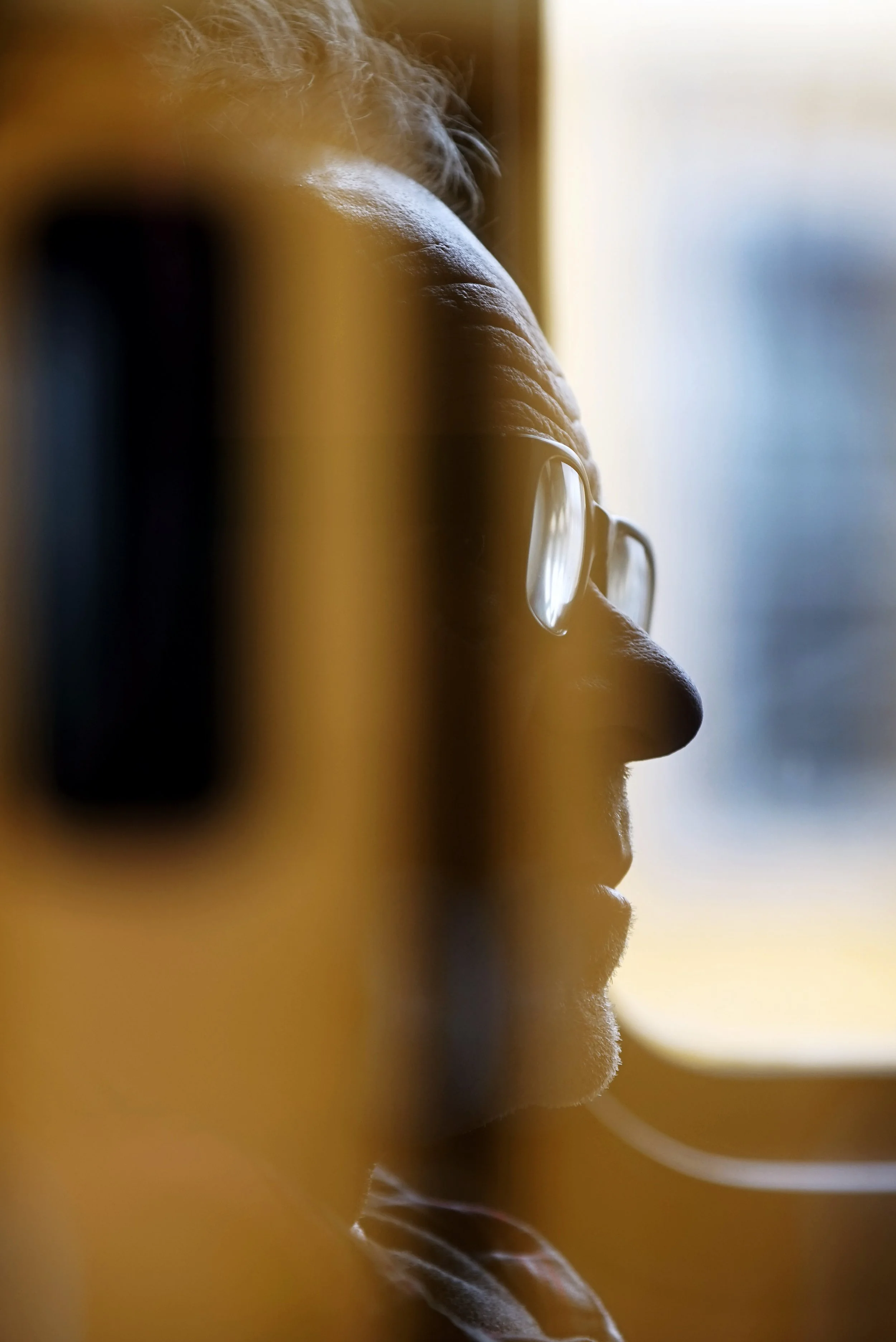 Silhouette of a person wearing glasses, viewed through a blurred foreground, with soft lighting. View fullsize
