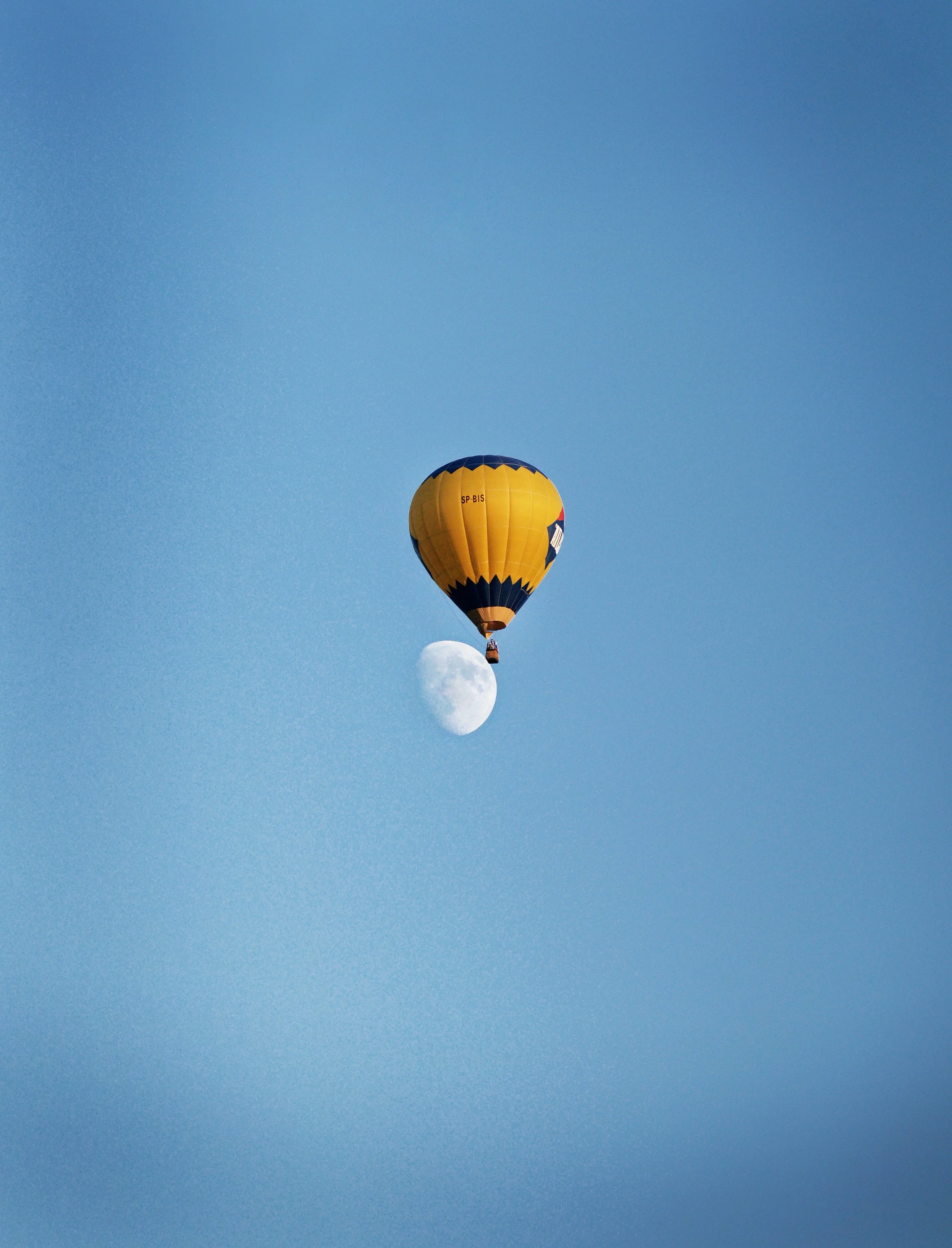 Yellow hot air balloon floating near a visible moon in a blue sky. View fullsize
