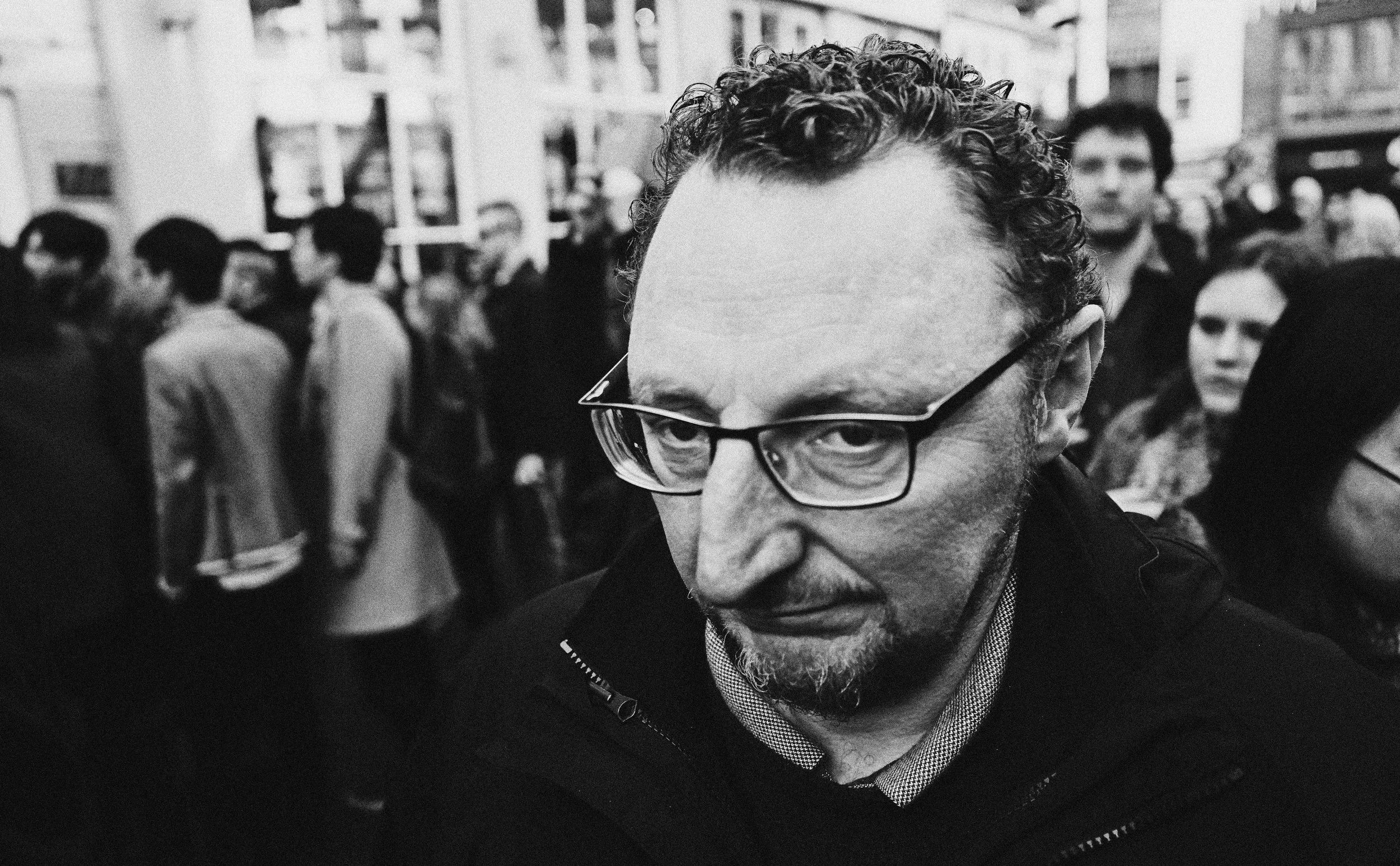 Black and white photo of a man with glasses in a crowded street, wearing a jacket, with a focused expression. View fullsize