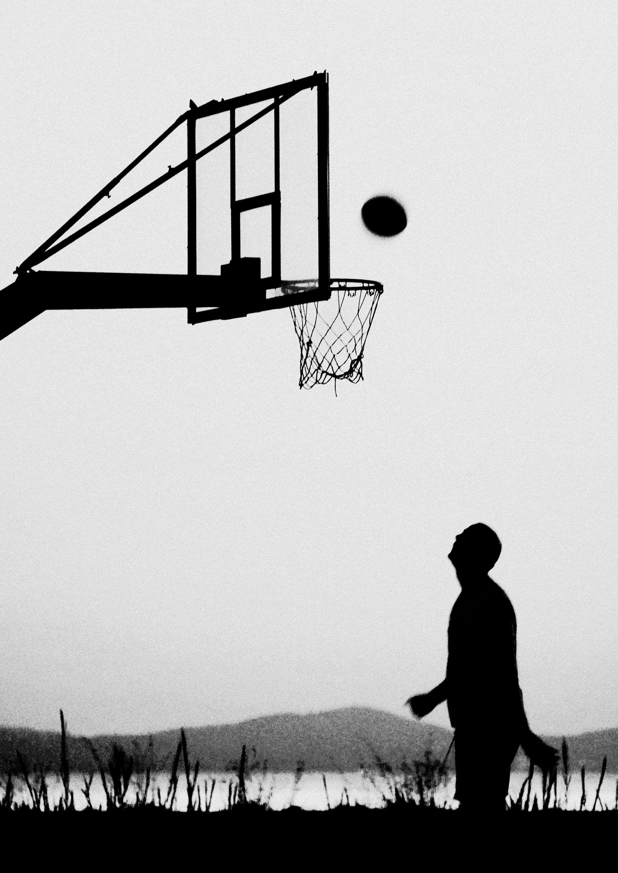 Silhouette of a person playing basketball near a hoop at sunset with hills in the background.