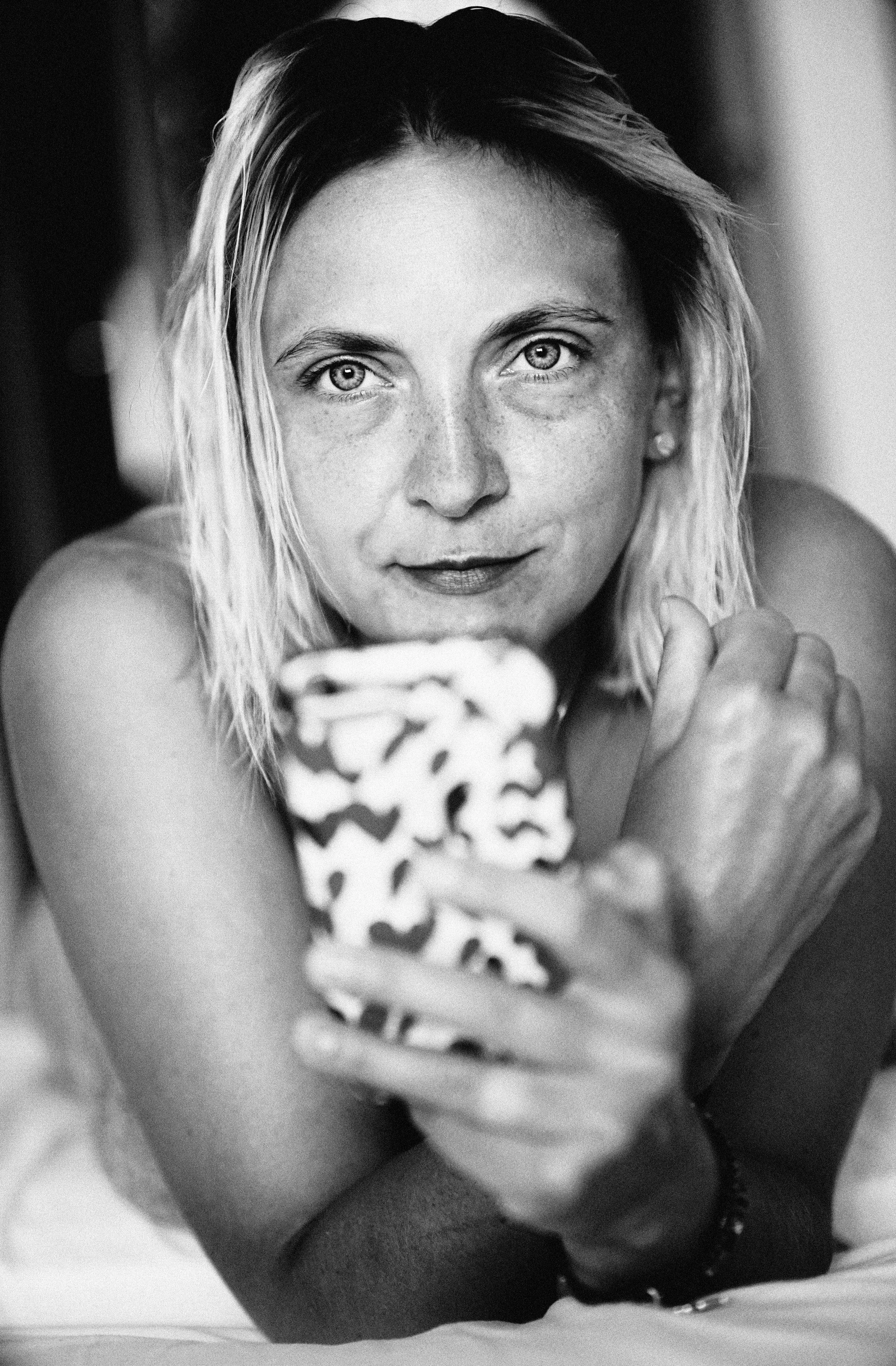 Black and white portrait of a person with short hair holding a patterned phone. View fullsize
