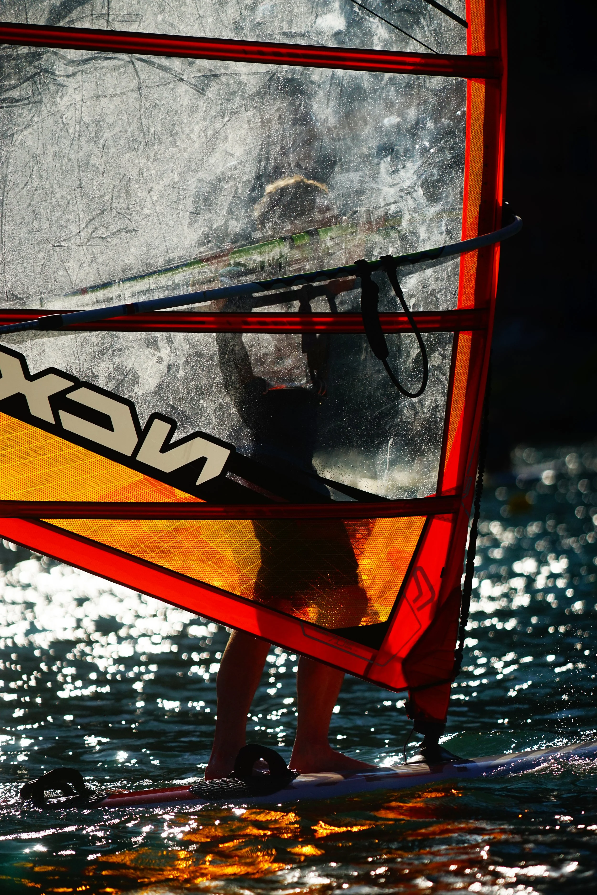Windsurfer silhouetted against the sunlight, standing on a board with a red and orange sail on water. View fullsize