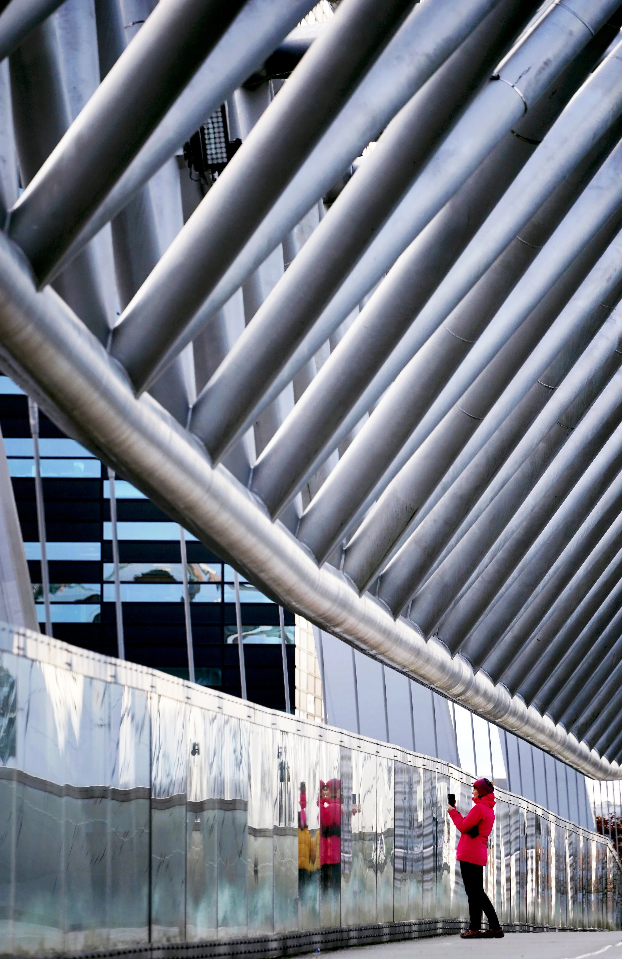 Person in a red coat taking a photo inside a modern structure with large metal beams and a reflective glass wall.