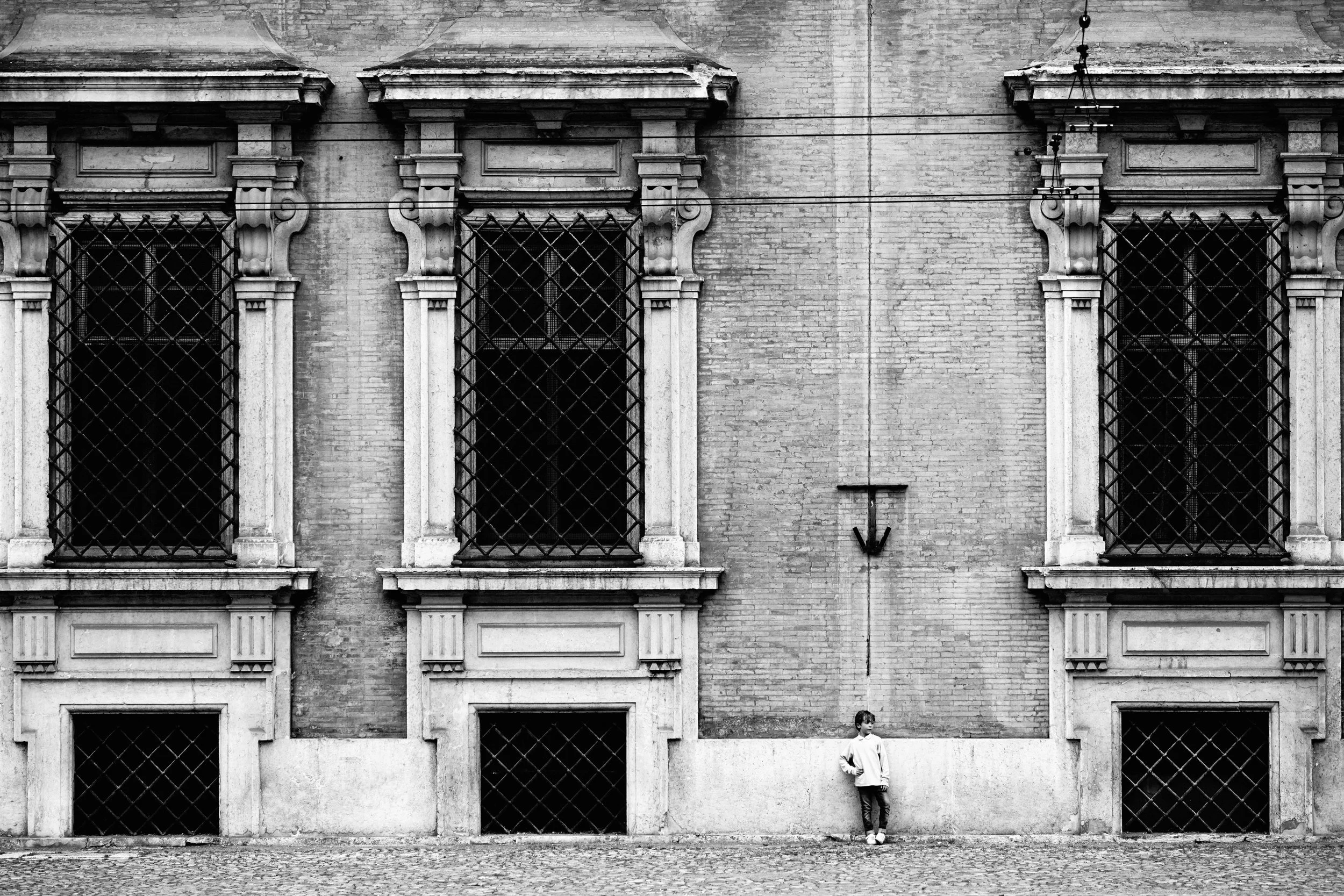 Black and white photo of a historical building with large windows and decorative columns. A person is standing on the right side against the wall.