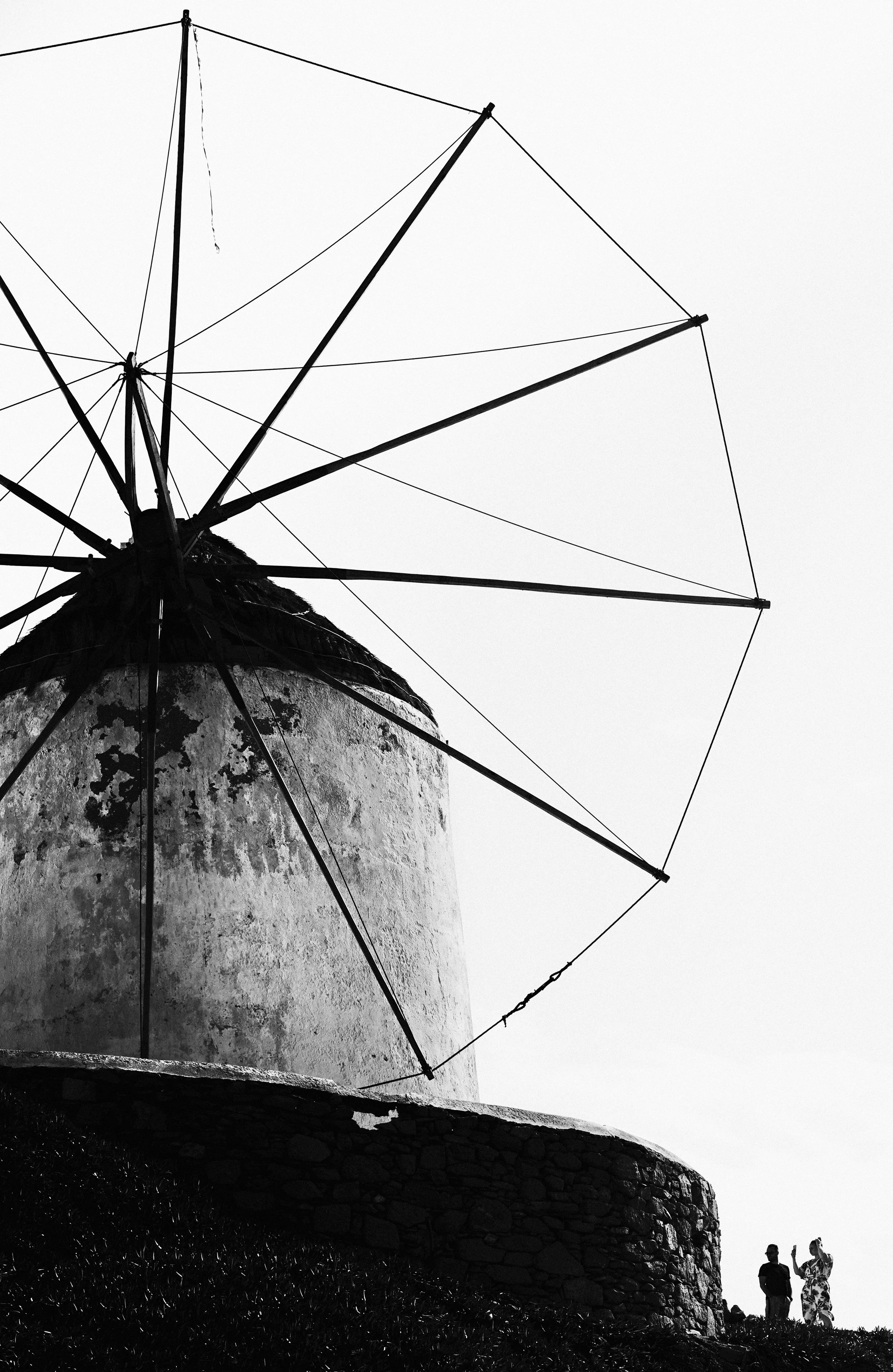 Black and white photo of a windmill with two people in the distance. View fullsize